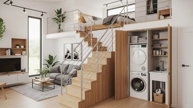 8 Ide Rumah Kecil Mezzanine dengan Area Laundry Tersembunyi di Bawah Tangga