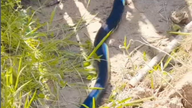 Ular tersebut berada di area alami, di atas tanah berumput dan rerumputan liar, dekat dengan semak-semak hijau dan batas tanah atau gundukan kecil. Sisiknya terlihat halus dan mengilap, memantulkan cahaya matahari sehingga warna birunya semakin menonjol.